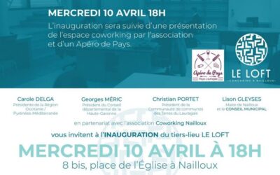 Inauguration du tiers-lieu le Loft 8 avril 2019 Rendez-vous mercredi 10 avril à 18h pour l’inauguration du tiers-lieu LE LOFT à Nailloux Lire la suite